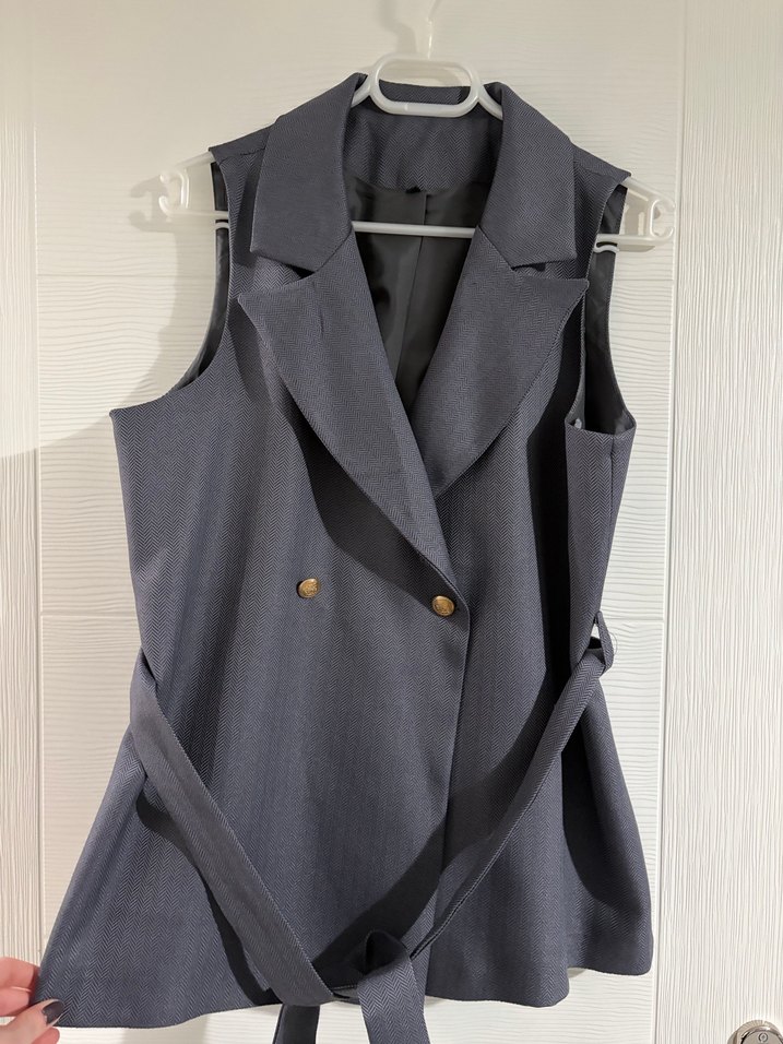 Düğmeli, gri renkte, yakalı ve kolsuz kadın yelek. Midi boy ve normal kesim, ofis kullanımı için uygun, sentetik kumaştan yapılmıştır.