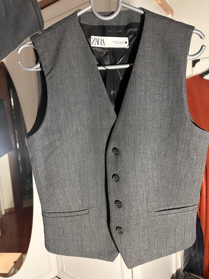Zara'dan gri, düğmeli, kolsuz kadın yelek. Notlu yaka, normal midi boy ve regular kesim. Ofis ve sokak stili için uygun. Yeni hiç kullanılmadı sadece etiketi mevcut değil #zara