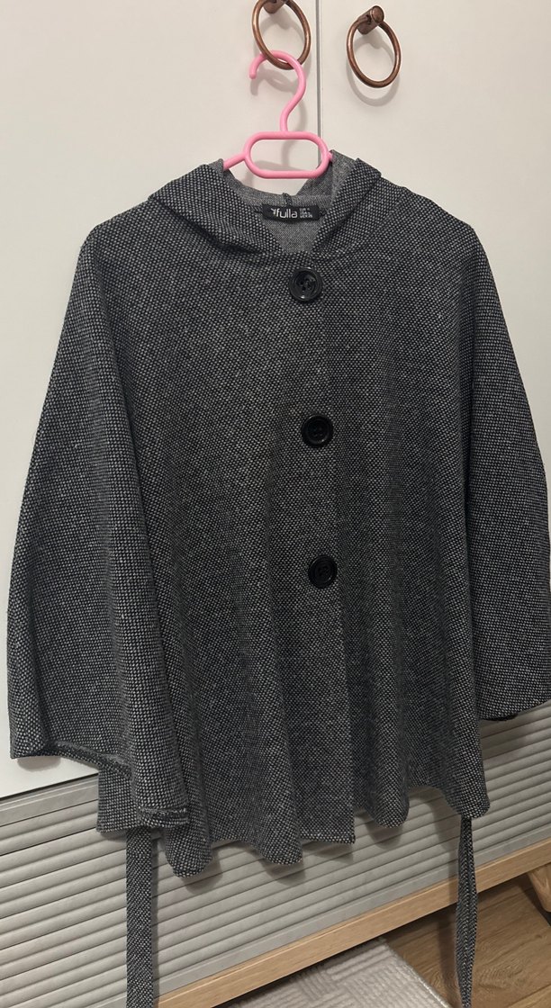 Gri renkte, düğmeli ve kemerli panço