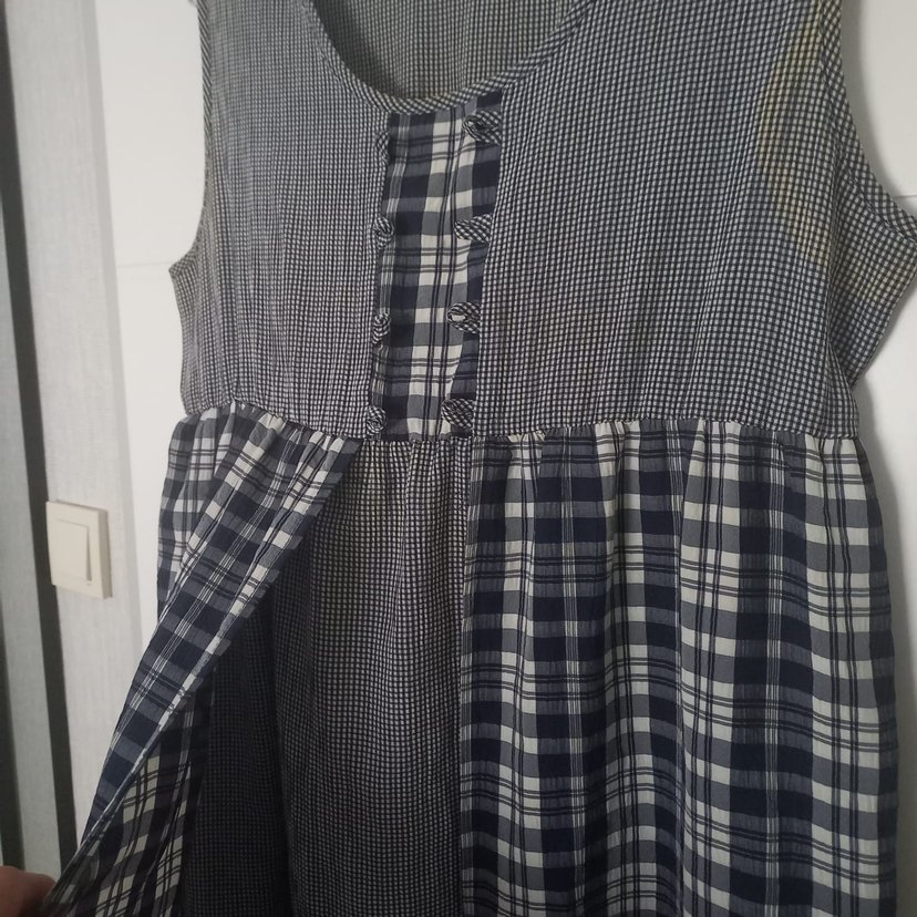 Düğmeli, keten kumaştan, salaş kesim ve uzun boyda, kayık yaka, kolsuz gri hamileelbise. Düz ve ekose desenleri bir arada sunar.