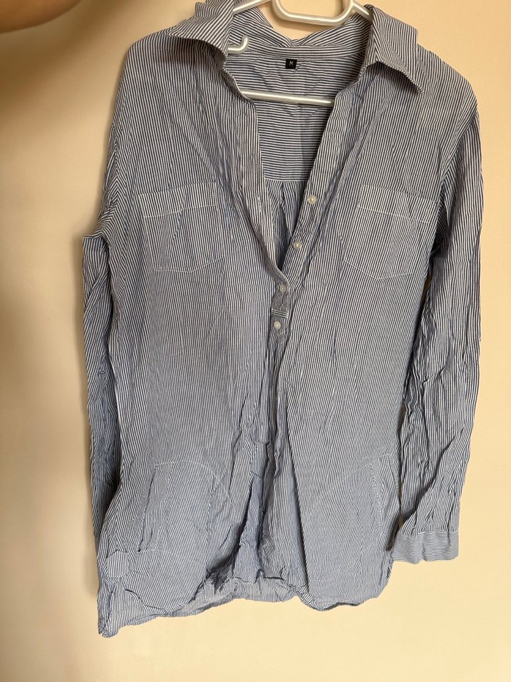 Düğmeli, uzun kollu, yakalı, bol kesim gri keten kadın gömleği. Günlük kullanıma uygun, sokak stilinde rahat bir model.