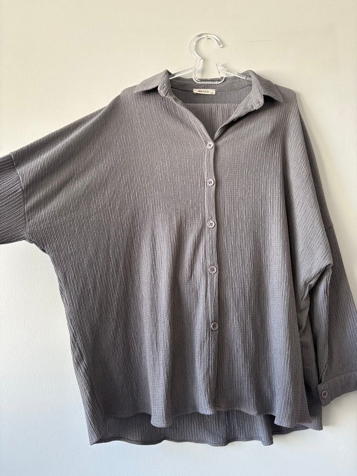 Gri keten kumaştan, düğmeli, uzun kollu, salaş kesim kadın gömlek takımı . Normal midi boyda, tek renk ve günlük kullanıma uygun sade stil.
