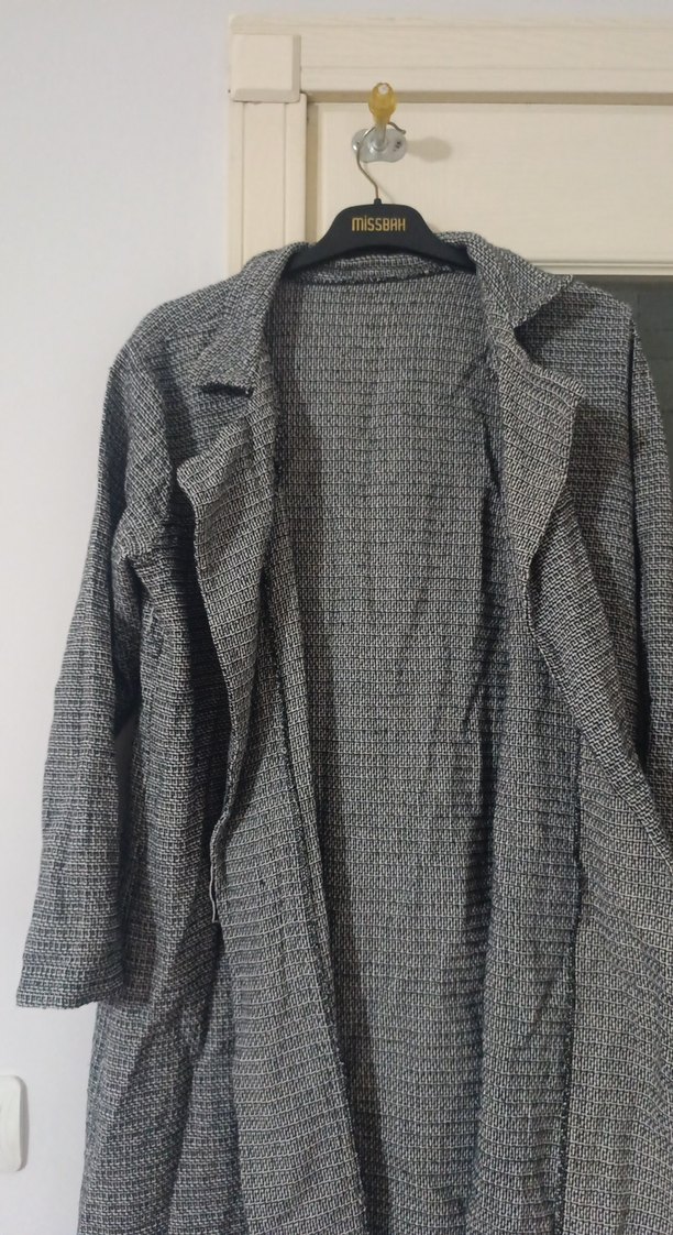 Gri keten kumaştan, düğmeli, uzun kollu, normal boy midi kaban. Notched lapel yakalı ve salaş kesim, günlük kullanıma uygun minimal tasarım.