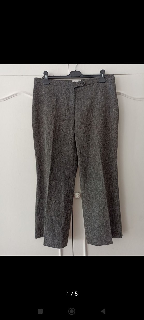 Gri keten kumaştan, düğmeli ve midi boy kadın pantolon. Normal kesim ve desensiz, iş ve günlük kullanıma uygun.