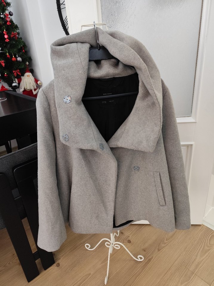 Gri düğmeli, kısa kesim ceket ı, notched lapel yaka ve uzun kolludur. Yumuşak ve sıcak kumaştan, rahat kesimdir. ürün çok tarz çift düğmeli