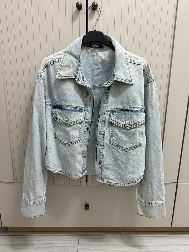 Gri renkli, düğmeli kısa denim ceket, uzun kollu ve notched yaka detaylıdır. Rahat kesimi ve cep detaylarıyla sokak stiline uygundur.