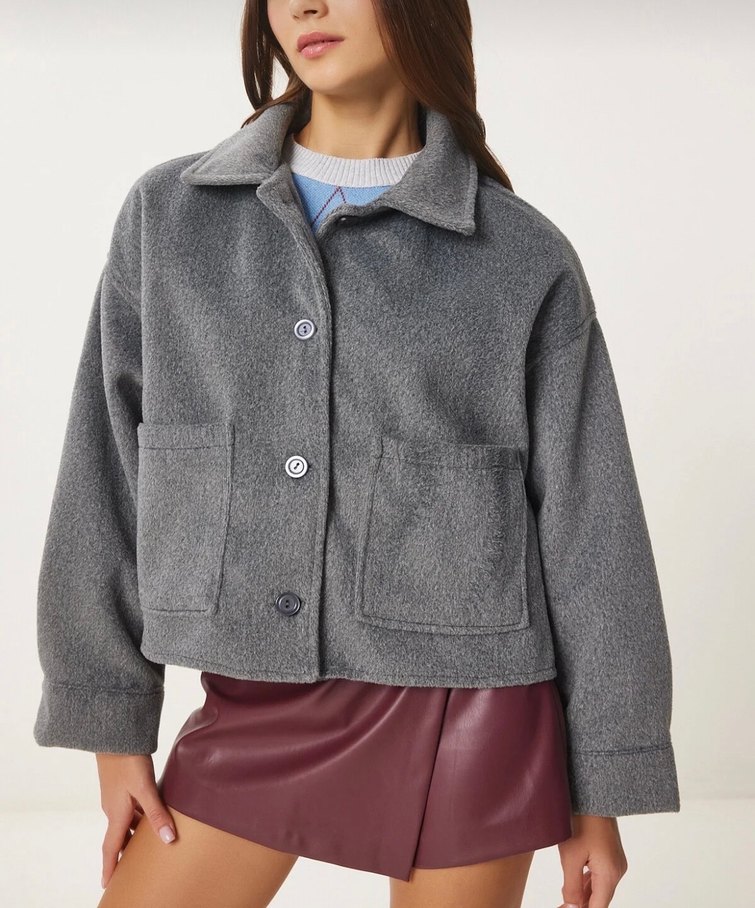 Gri renkte, düğmeli ön kısmı ve kesik yaka detayı olan kadın kabanı. Yumuşak ve sıcak kumaştan üretilmiş, uzun kollu ve normal kesim. Günlük rahat kullanım için uygun midi boy kaban.