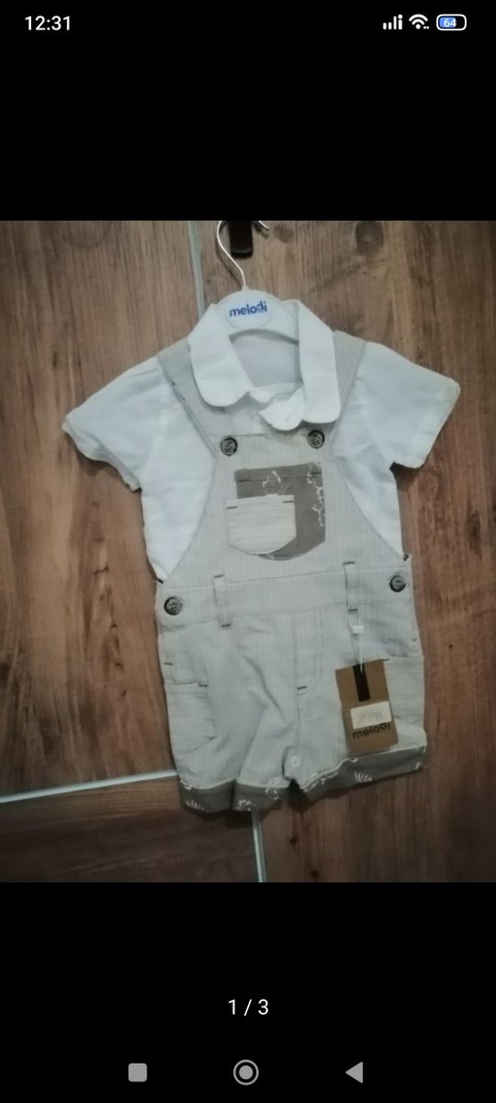 Pamuklu, düğmeli ön kısmı ve notalı yaka detaylı kısa kollu gri bebek tulumu. Günlük sokak stili için uygundur.
