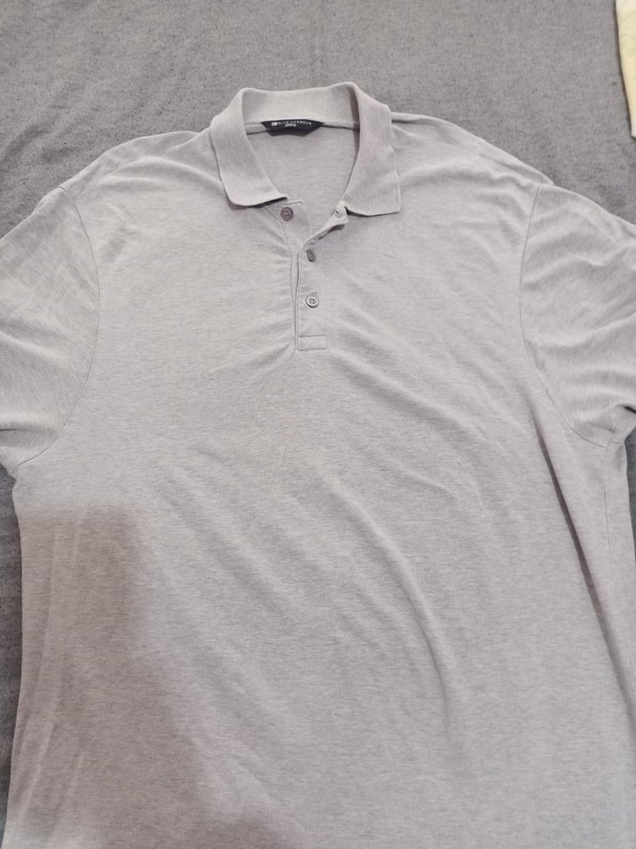 Düğmeli önü ve yakası olan gri erkek polo tişört. Nefes alan keten kumaştan, bol kesim ve normal boyda, günlük sokak stili için uygun. göğüs 60 boy 75