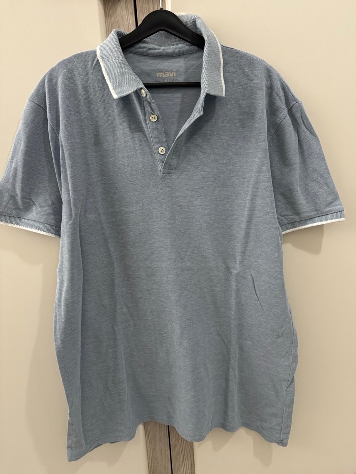 Gri renkli, düğmeli ve kısa kollu erkek polo tişörtü. Nefes alan keten kumaştan, rahat ve günlük kullanım için ideal.