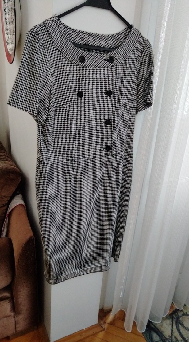 Gri renkli midi boy elbise, düğmeli ön ve kısa kolludur. Regular kesimi, kesik yaka ve kareli deseniyle ofis için uygundur.