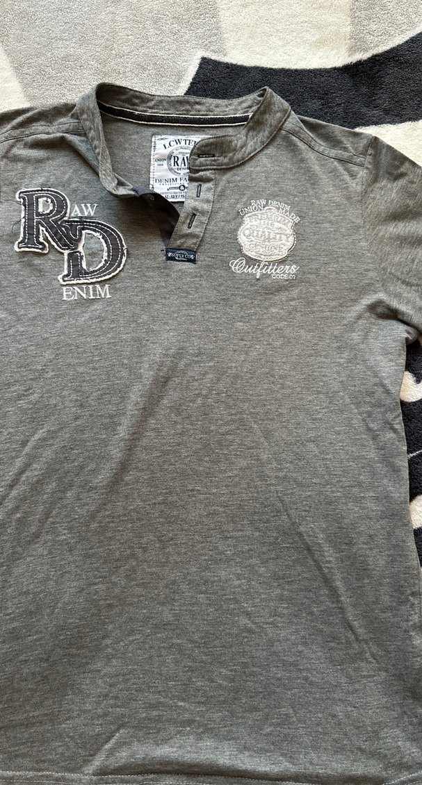 Gri pamuklu polo tişört, düğmeli yuvarlak yaka, kısa kollu ve bol kesimdir. Göğüs kısmında baskılı desenler bulunur, günlük rahat sokak stili için uygundur.