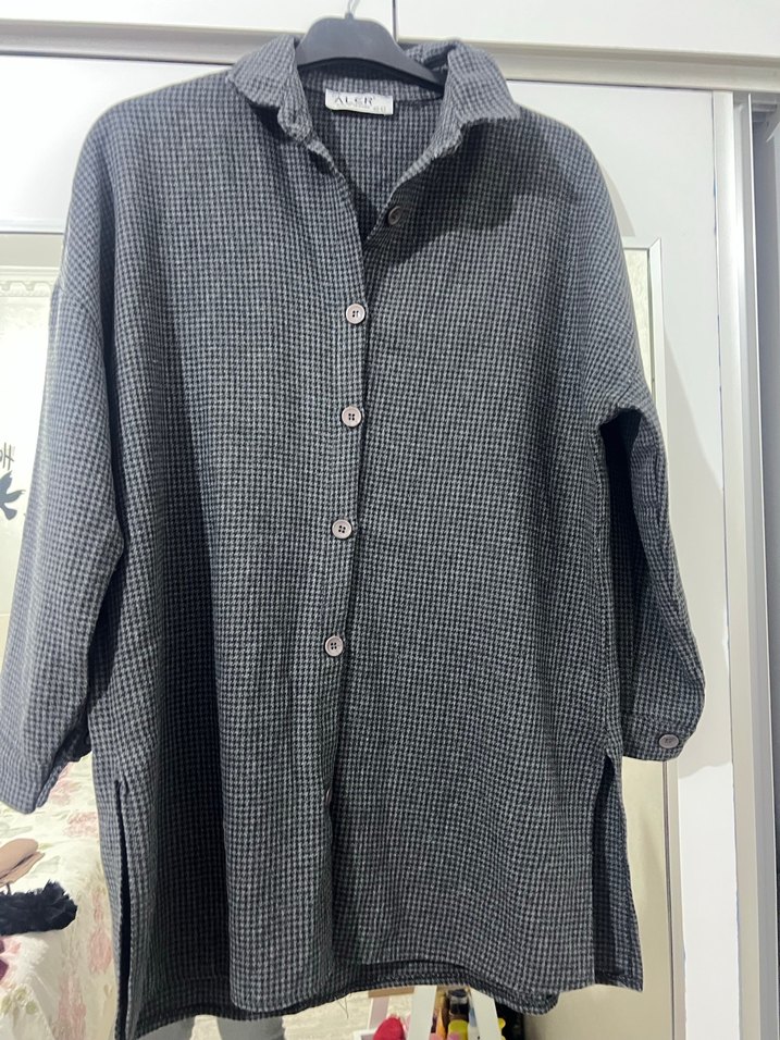 Gri keten, düğmeli, uzun kollu, normal boy midi uzunluğunda, rahat kesim kadın gömleği. Notlu yaka detayı bulunur.