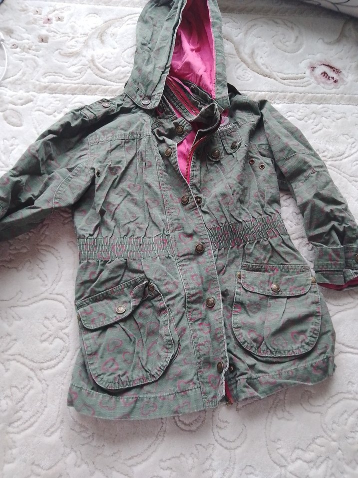 Gri, düğmeli, kapüşonlu ve notched lapel yaka detaylı, bol kesim kız çocuk ceketi. Büyük cepleriyle sokak stiline uygun rahat bir tasarım.