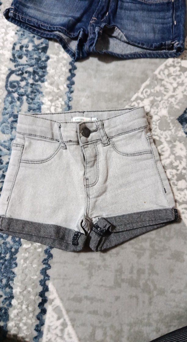 Düğmeli, gri renkli, bağlama desenli ve fitted kesime sahip kız çocukları için denim şort. dar kalib