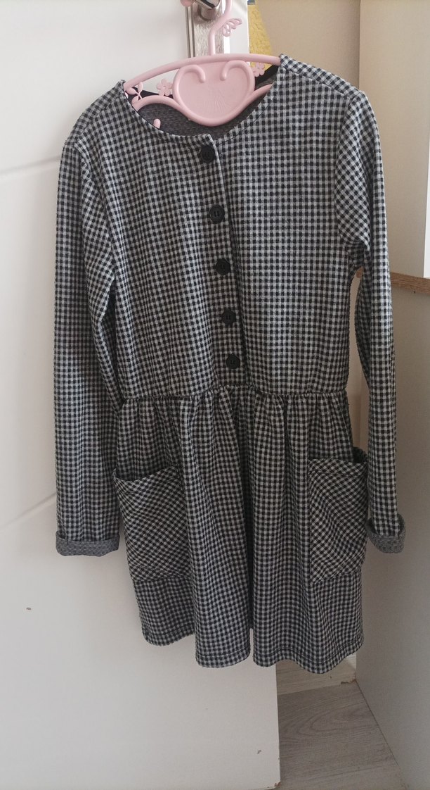 Gri kareli desenli, düğmeli, uzun kollu, cepli ve notched lapel yakalı bol kesim kız elbisesi.