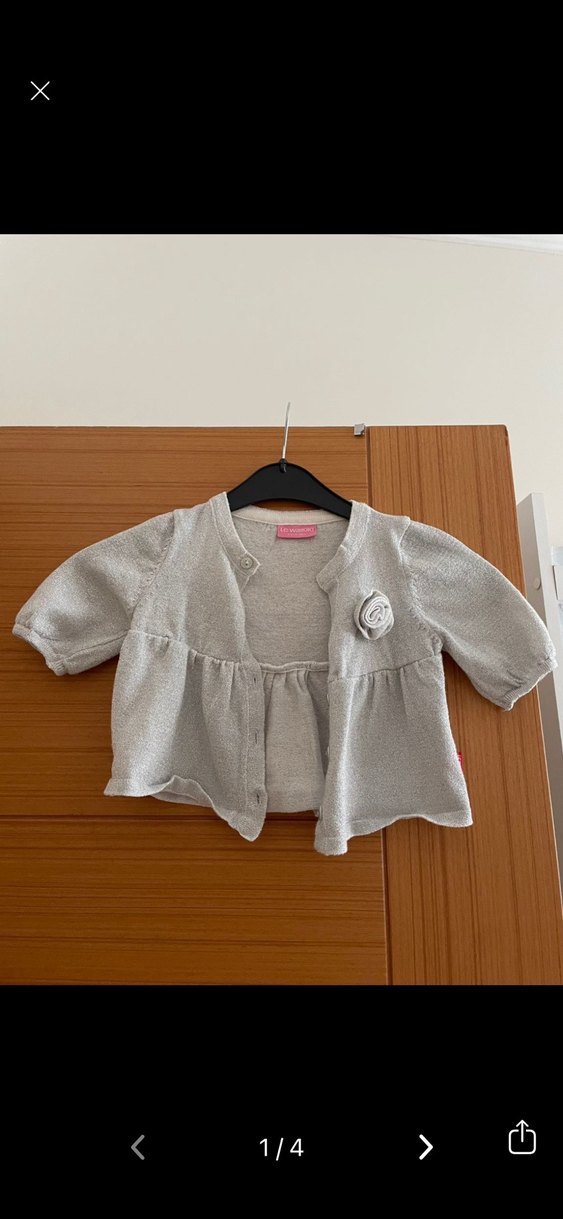 Gri, düğmeli, uzun kollu ve bol kesim kız hırkasıdır. Yumuşak örme kumaştan yapılmış, sade ve desen içermeyen, çiçek detaylıdır.