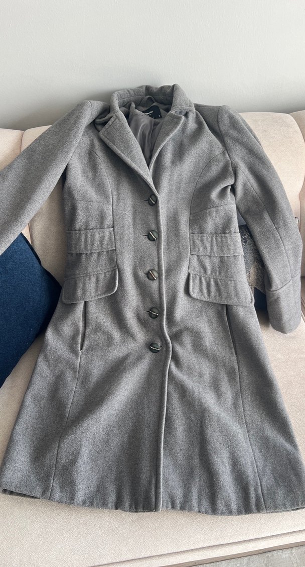 Klasik gri kaban, düğmeli kapama ve vücuda oturan kesimiyle şık bir görünüm sunar. Sıcak ve yumuşak kumaştan, önünde kapaklı cepler ve yapılı yaka bulunur.