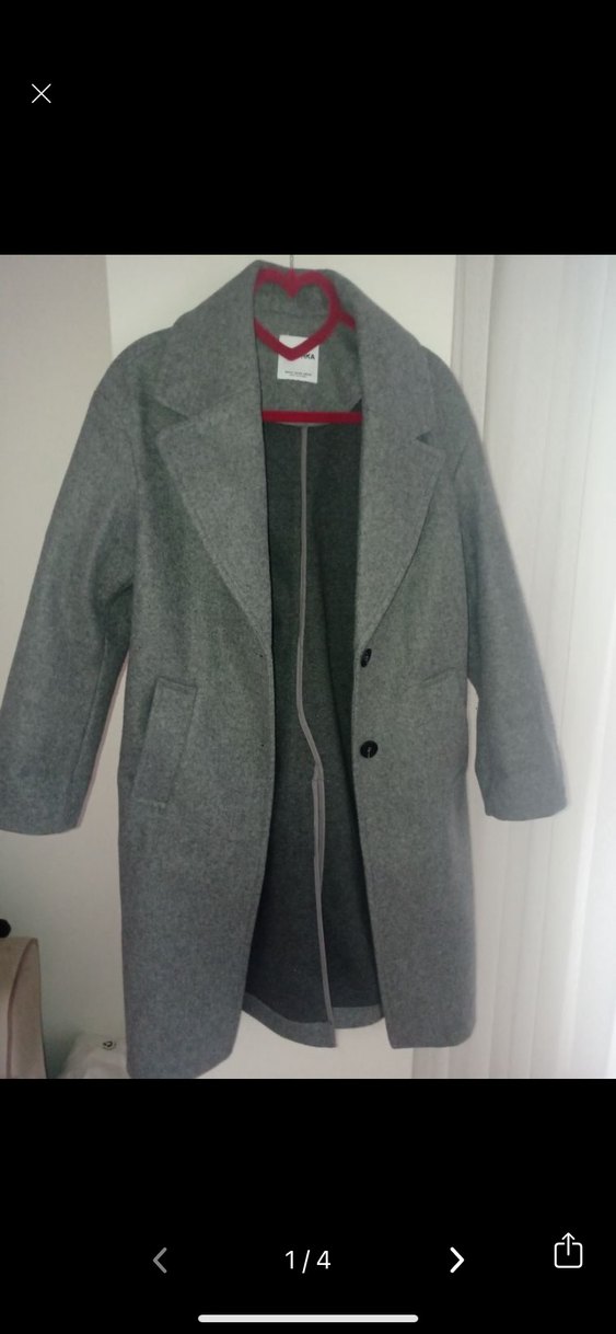 Gri renkte, düğmeli klasik tasarıma sahip, cepli sıcak tutan kaban. Bir iki kez giyildi, yeni gibi.
