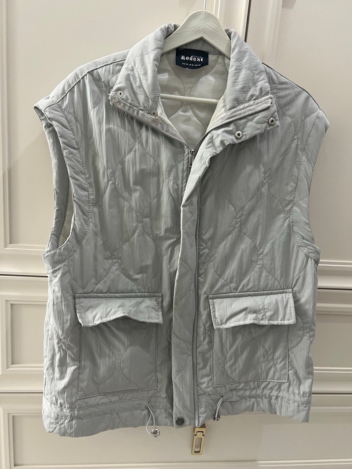 Yüksek yakalı, düğmeli gri kolsuz yelek. Keten kumaştan, bol kesim ve midi boyda, günlük rahat kullanım için uygundur.