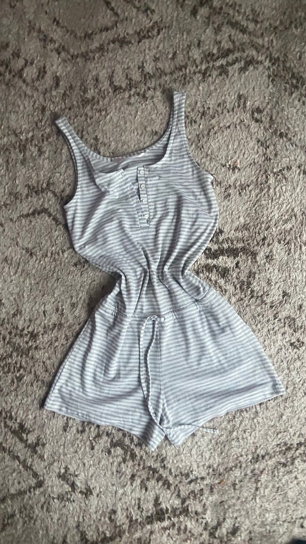 Gri renkli, düğmeli ön ve bağcıklı bel detaylı, pamuk dokulu kolsuz kısa tulum. Rahat kesimi ve ince çizgili deseniyle günlük sokak stili için uygun.