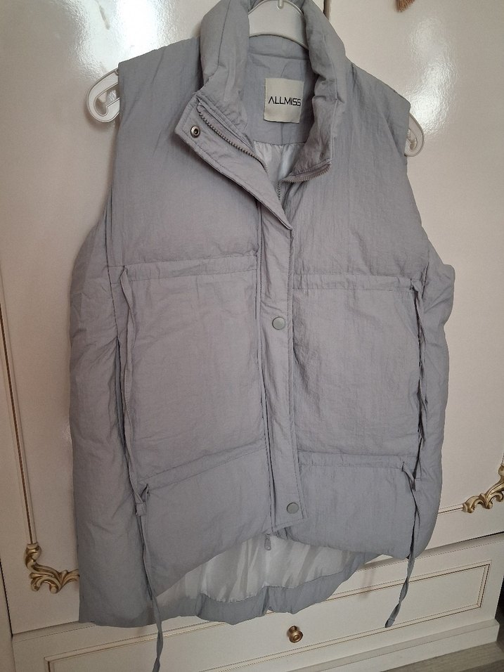 Gri şişme kumaştan, düğmeli ve yakalı kolsuz yelek. Rahat kesimi ve midi boyu ile günlük sokak stiline uygun.