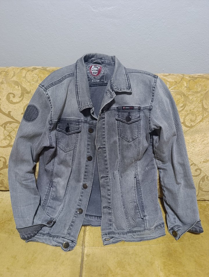Gri kot ceket, düğmeli ve kesik yaka detaylıdır. Normal boyda, uzun kollu ve regular fit kesime sahiptir, günlük sokak stiline uygundur.