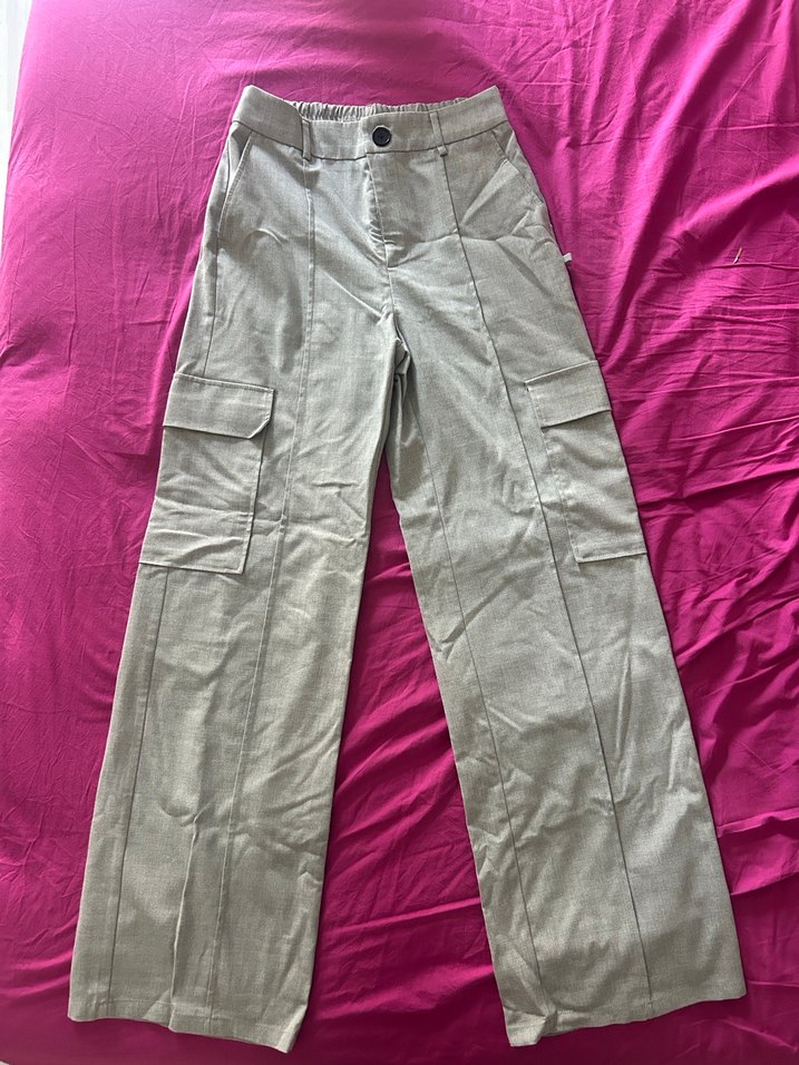 Gri renkli, düğmeli, midi boy kadın kumaş pantolon. Regular kesim ve sentetik kumaştan, sokak tarzı için uygun, günlük kullanıma ideal.