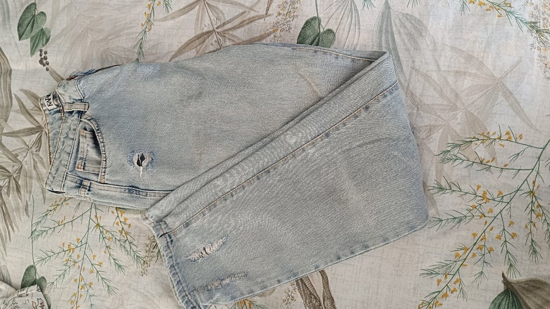 Gri denim kumaştan, düğmeli ve loose fit kadın kot pantolon. Normal midi boyda, yırtık detaylı, günlük sokak stiline uygun.