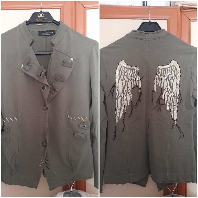 Gri renkte, düğmeli ve normal kesim midi ceket. Arkasında baskılı kanat desenleri bulunur. Uzun kollu, sokak modasına uygun bir parça.