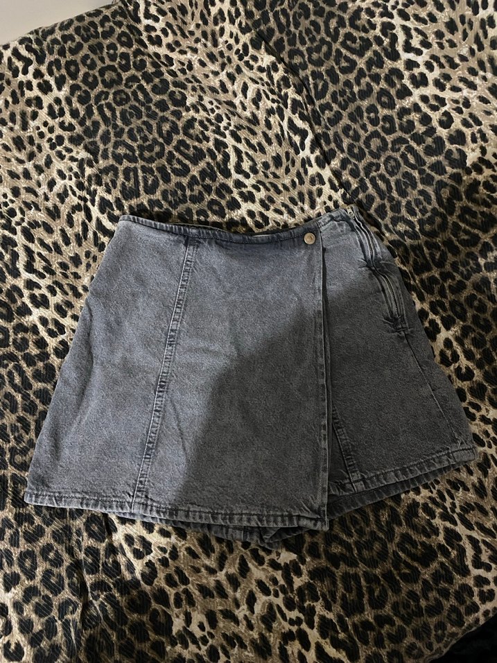 Gri renk, düğmeli ve bağcıklı detaylı, bol kesim midi denim şort, gündelik sokak stili için uygundur.