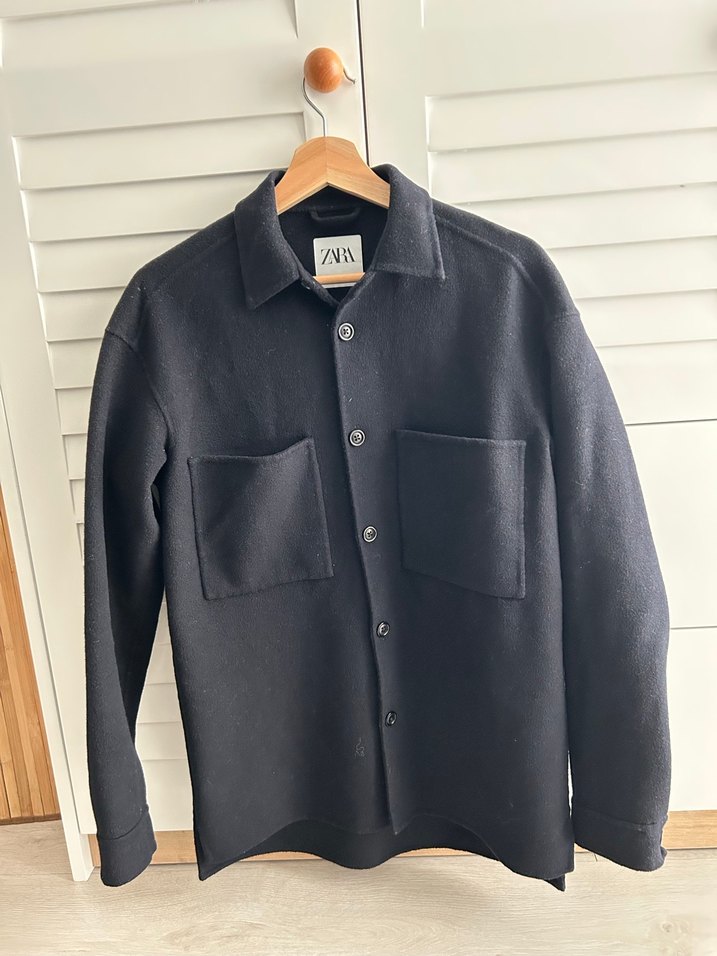 Lacivert yün ceketin düğmeli önü ve kesik yakası vardır. Rahat kesim ve uzun kolludur, günlük sokak stili için uygundur. İki büyük cepli minimalist tasarıma sahiptir.