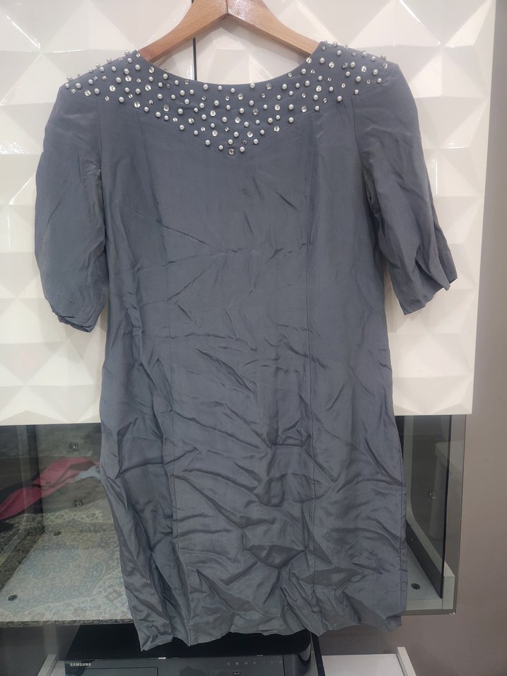 Gri midi gece elbisesi, kısa kollu, V yakalı ve düğme detaylıdır. Salaş kesimiyle rahat bir kullanım sunar, minimalist tarzda sokak modasına uygundur.