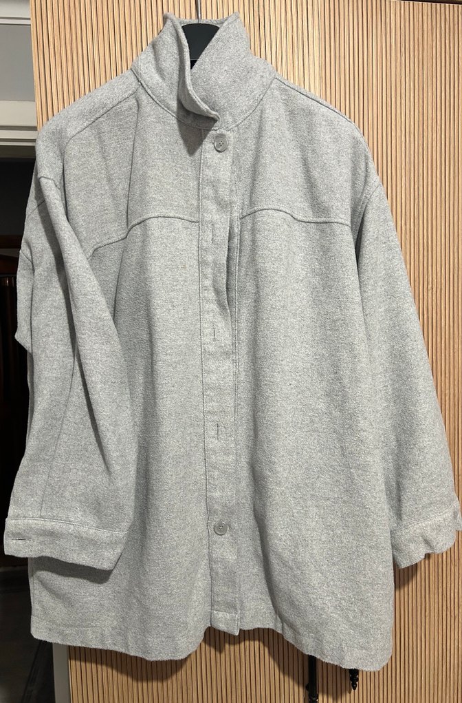 Gri renkte, düğmeli, uzun kollu, normal boy midi hamile ceketi. Rahat ve yumuşak kumaştan, notlu yaka tasarımıyla günlük kullanıma uygun.