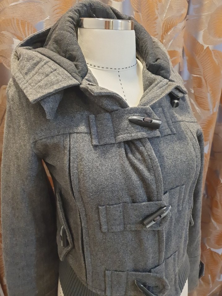 Bu fitted gri hamile kaban, düğmeli ön ve kesik yakaya sahiptir. Yumuşak, sıcak kumaştan yapılmış olup uzun kollu ve midi boyda rahat bir sokak stili sunar. Günlük kullanıma uygundur.