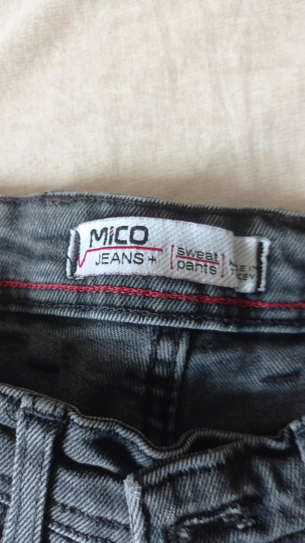 Gri denim kumaştan, düğmeli ve baskılı desenli, normal boy midi kesim, dar kesim kadın jean pantolon. MiCO markalı.