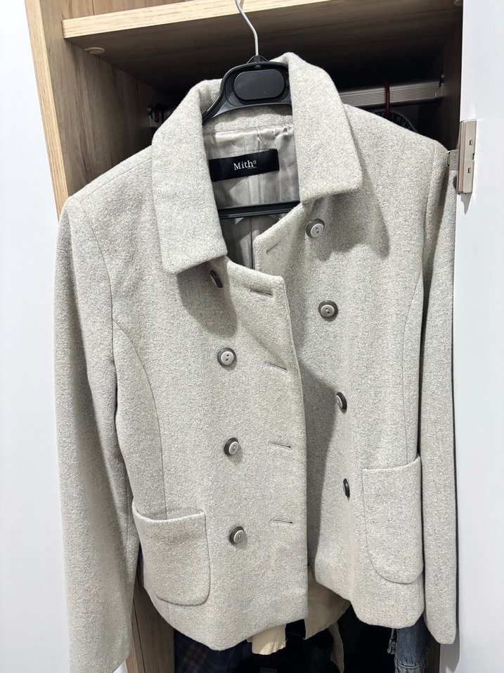 Gri yün kaban, düğmeli ön ve kesik yaka detayına sahiptir. Uzun kollu ve midi boyda, günlük sokak stili için uygundur.