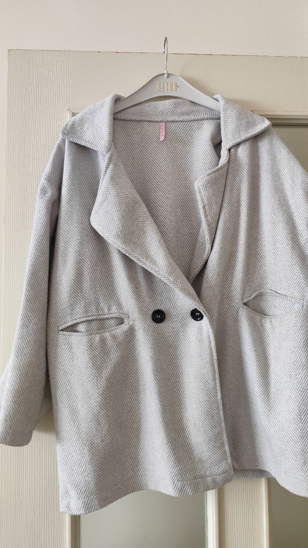 Gri renginde, düğmeli ve yakalı kaban. Yumuşak keten kumaştan, uzun kollu ve midi boyda, günlük kullanıma uygun.