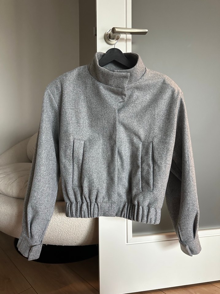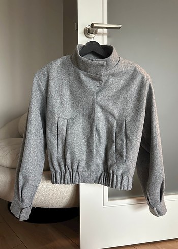 Gri düğmeli ceket, yakalı ve uzun kollu, yumuşak ve sıcak kumaştan. Rahat kesimi ve midi boyuyla günlük sokak stiline uygun. Kumaşı incedir. S-M uyumlu