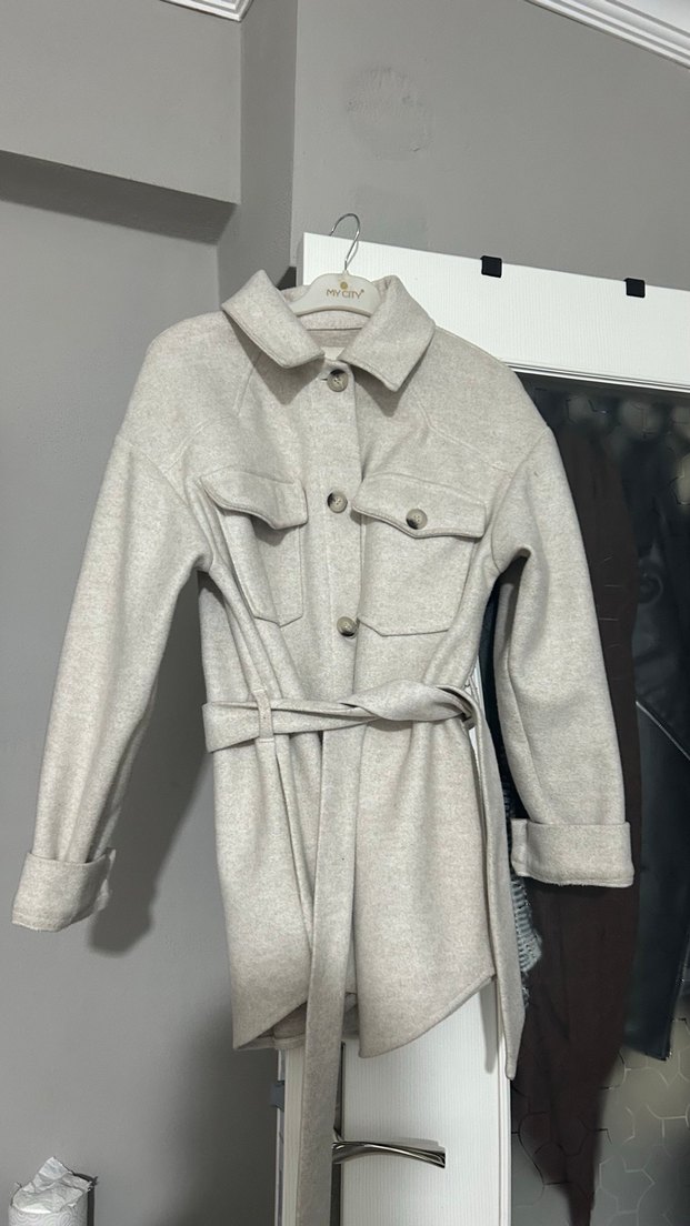 Gri, düğmeli, uzun kollu, yakalı, kuşaklı, bol kesim midi kaban. Sokak stiline uygun, rahat ve günlük kullanım için ideal.
