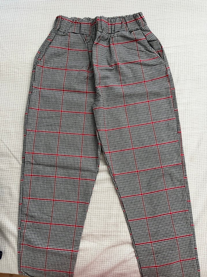 Gri midi uzunlukta kadın kumaş pantolon, düğmeli detaylara ve hafif kareli desene sahip, günlük kullanıma uygun.
