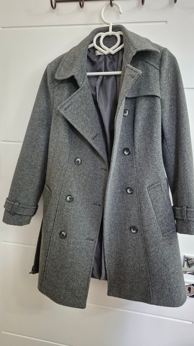 Gri yün kaban, düğmeli ön ve kesik yakalıdır. Modern klasik tarzda, normal kesim ve uzun kolludur, ofis için uygundur. 38 beden defosu söküğü yırtığı yoktur. Hiç giyilmedi alındığından beri dolapta duruyor. Tertemiz defosuz