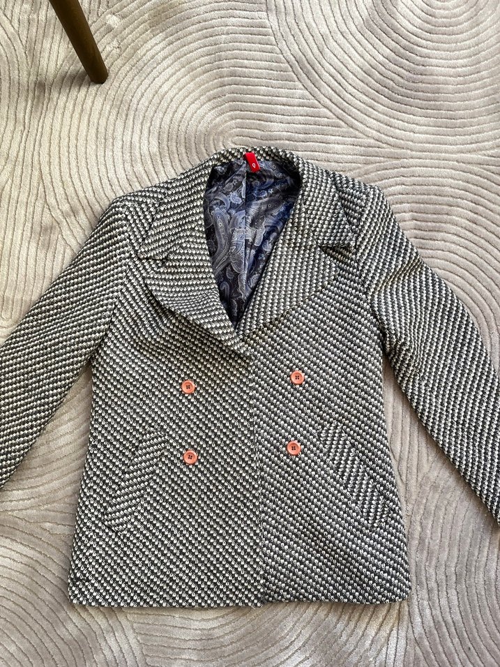 Gri renkli, düğmeli ön ve kesik yakalı midi uzunlukta yün kaban. Desenli kumaş ve uzun kollu, ofis kullanımı için uygun.sorunu yok s-m uyumlu