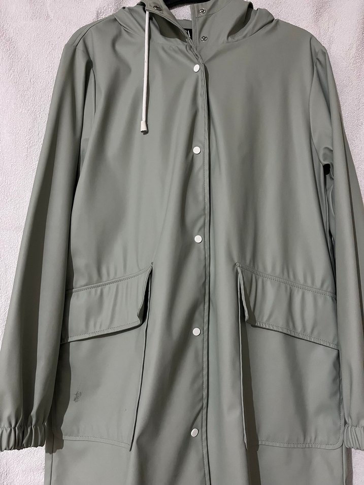 Yeşil midi uzunlukta, düğmeli, kapüşonlu ve cepli yağmurluk. Uzun kollu ve bol kesim, sentetik kumaştan üretilmiştir. ️