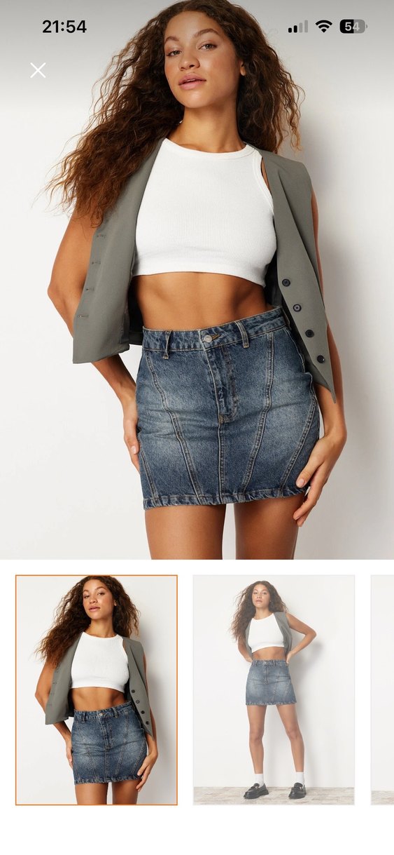 Düğmeli önü ve gri denim kumaşıyla, günlük kullanıma uygun dar kesim mini etek. Sokak modasına uygun sade tasarım.