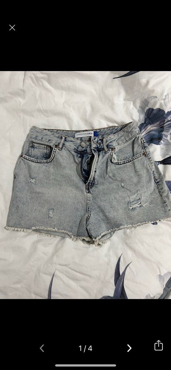 Düğmeli ve hafif yıpranmış detaylara sahip, bol kesim gri kot şort. Günlük kullanım için uygundur.