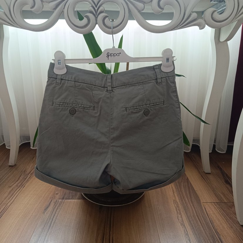 Gri pamuklu mini şort, düğme detaylı . Rahat ve sade tasarımıyla günlük dış mekan kullanımına uygun.