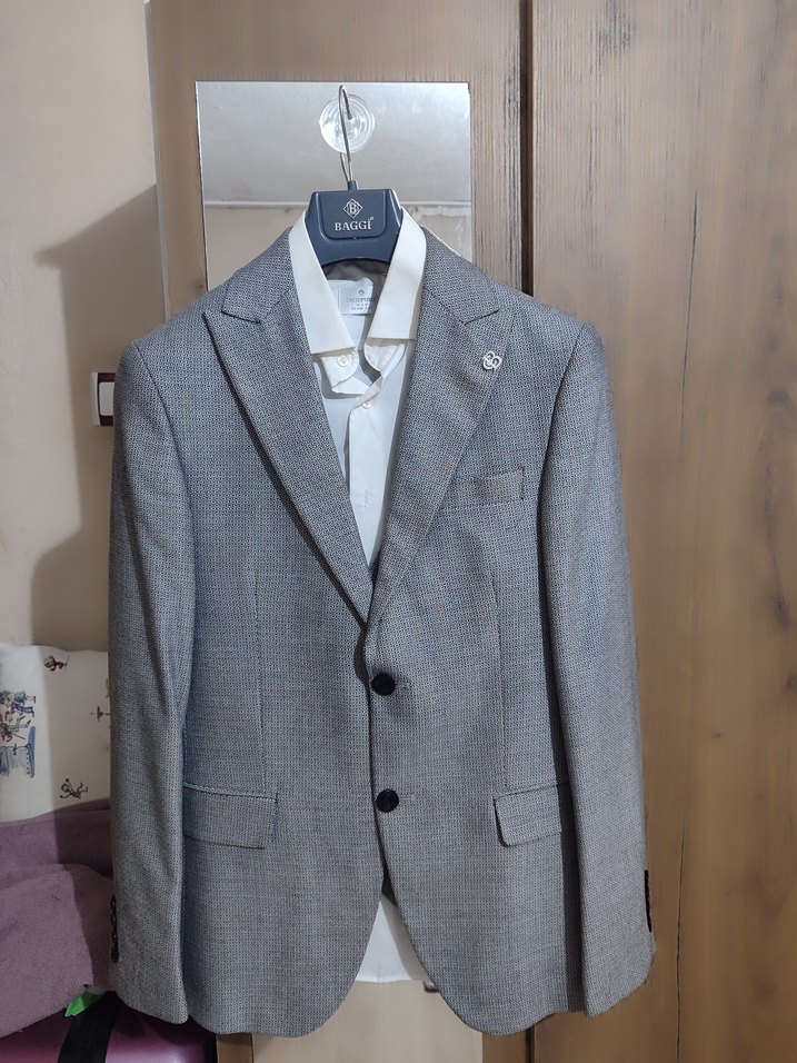 Gri renkte, düğmeli ve normal boyda erkek takım elbisesi. Modern klasik tarzda, ofis kullanımı için uygun, uzun kollu ve klasik şıklık sunar. ️