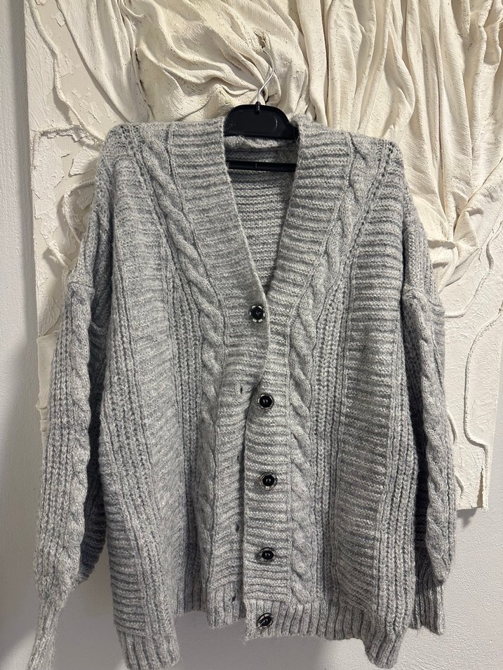 Gri örgü kadın hırka, düğmeli, bol kesim, uzun kollu ve yakalıdır baya kalındır hiç kullanılmamıştır alıcısna hayırlı olsun