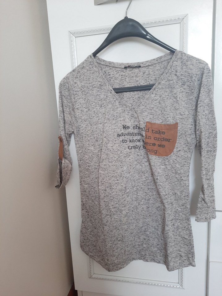 Gri pamuklu, uzun kollu hamile tişörtü, baskılı ve düğmeli detaylara sahip. Bisiklet yaka ve normal boyda, rahat kesim sokak stili için uygun.